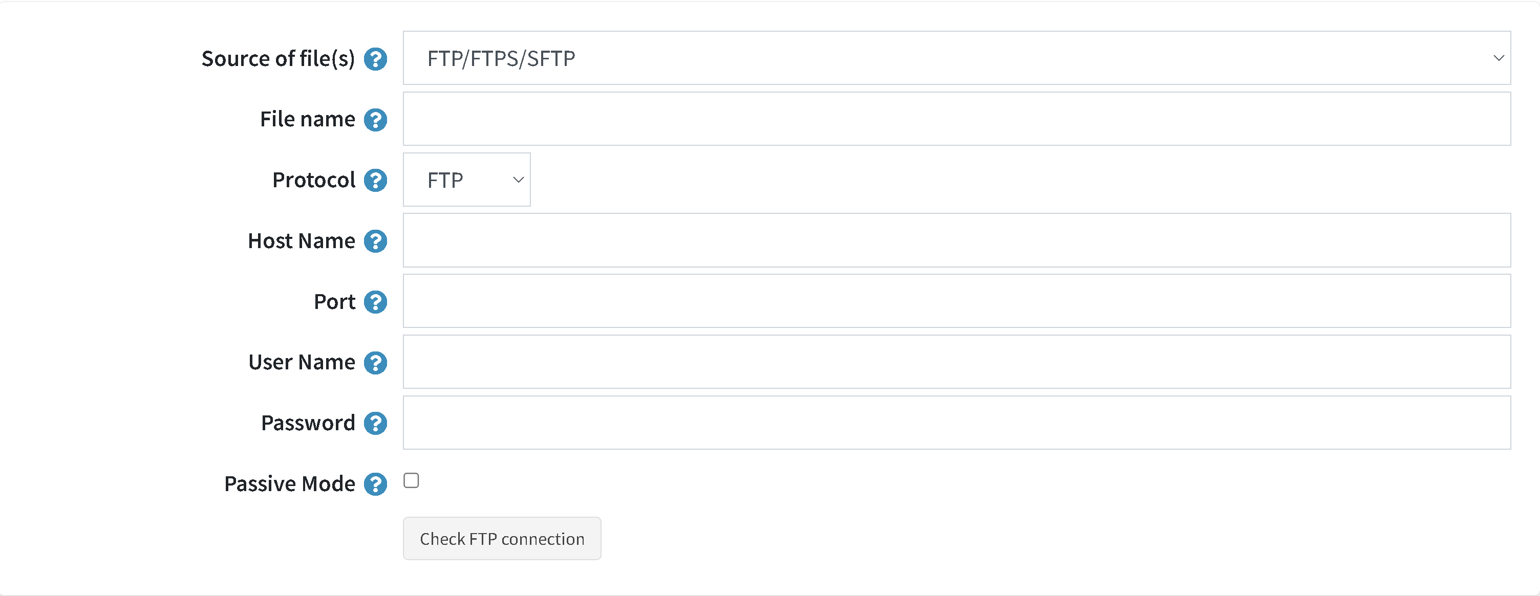 Select **FTP** in File Source, you would see fields to input your FTP credentials and to input path to your feed file on FTP server. You can use paths similar to [importing folder from server](#server-folder-or-file). After you input your credentials, click on **Check FTP connection** to validate your credentials, and then you can **Save** your template.